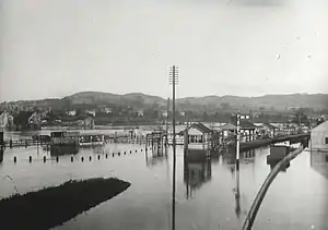 May Hill Station during floods, probably in 1910. The River Wye runs across middle of the picture and quayside buildings are located to the middle and left.
