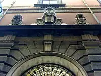 The portal has Doric order columns. In the entablature you enter three triglyphs that create two empty spaces in the frieze, in these empty spaces are placed two inscriptions, one of which is the date of commencement of work: