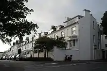 This runs east–wast across the slope of the hill, and has private gardens on the site of the former windmill which moved to Albion Hill in 1837.[51] Most construction work took place in 1846–47,[56][110] but the 23-house terrace[111] and its gardens were not finished until 1851.[51] The houses combine the Regency-style "gaiety and exuberance" with the "charm and vigour" of Victorian architecture,[112] and the use of angled bay windows set below tented canopies is a late example of this distinctive local practice.[113] Each house is built as a villa, mostly with a three-window range shared across two neighbouring houses (the middle window is blank). Numbers 12–14 project slightly and are taller.[51][111] The houses are raised above the roadway, giving views into the private gardens on the south side[51] and "a commanding view of the sea".[113] Number 25, which stands separately and was also listed, was originally the Clifton Arms pub.[56]