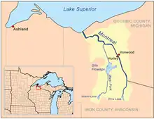 The Montreal River is a river flowing to Lake Superior in northern Wisconsin and the Upper Peninsula of Michigan in the United States. It is 47.8 miles (76.9 km) long[3] and drains approximately 270 square miles (700 km2) in a forested region. For most of its length, the river's course defines a portion of the Wisconsin–Michigan border. The Ojibwe name for the river is Gaa-waasijiwaang, meaning "where there is whitewater".[5][6]