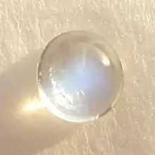 Polished moonstones often display chatoyancy ("cat's eye" effect), where a luminous streak appears through the stone. Asterism is rare and produces four-legged stars.[1]