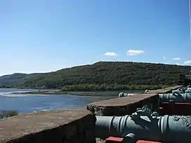 Mount Defiance from Fort Ticonderoga. The LaChute River, leading to Lake George, is at right; the southernmost reaches of Lake Champlain at left | |