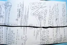 For the choir of "IV: Mount Eerie", Elverum put up posters in Olympia, Washington, asking for singers.[5] He recorded eight singers. In the section labelled "Big Black Death", referred to by Elverum as "Kyle's rap", Kyle Field wrote and sang the lyrics for the personification of death.[5] A line from the section, “Do you see what happens?” is a reference to the 1998 film The Big Lebowski.[5] Elverum attempted to write down all of his ideas for the album prior to recording the album. He created a chart of elements outlining what later became "I. The Sun" and the start of "II. Solar System".[3] Another chart was used to map out the complex drum rhythms on parts of "I. The Sun".[3] A further two charts were used to plan out the harmonies and track recordings for "III. Universe", and another with rough lyrics from "V. Universe". Some lyrics from the album were inspired or directly taken from lines in Elverum's journals, which date to late 2001.[3]