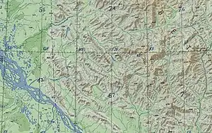 The Muosuchan Range is one of the subranges of the Verkhoyansk Range system and is located in its southwestern section.[3] It stretches roughly from northwest to southeast between the Bygyn Range to the west and the Tagindzhin Range to the east, running in a roughly parallel direction to both ranges. The southeastern end is bound by the valleys of the Munni (a tributary of the (Belyanka) and the Buruolakh (a tributary of the (Lyapiske), beyond which the Munni Range stretches eastwards.[4][5]