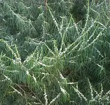 Myoporum floribundum, commonly known as weeping myoporum or slender myoporum, is a sour-smelling glabrous shrub in the family Scrophulariaceae endemic to a small area of New South Wales and Victoria in Australia. It has long, thin, drooping leaves and profuse white flowers in clusters along the stems in spring. Although it is uncommon in nature, it has long been available as a popular garden plant.