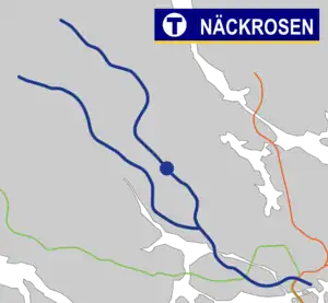 Näckrosen (meaning the water lily) is a station on the Stockholm metro, blue line. The station is located in Solna Municipality (northwestern end of Råsunda area), but one of the entrances is in Sundbyberg Municipality (Storskogen square). The Näckrosen station was opened on 31 August 1975 as part the first stretch of the Blue Line between T-Centralen and Hjulsta. The trains were running via Hallonbergen and Rinkeby.[2] It is located deep underground under a residential area, close to the Gamla Filmstaden former movie production area.