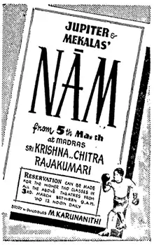 Naam was jointly produced by Jupiter Pictures and Mekala Pictures. Joint partners of Mekala Pictures, a new venture in movie production, then included M. Karunanidhi, M.G. Chakrapani, M.G. Ramachandran, P.S.Veerappa and A. Kasilingam. M. Karunanidhi wrote the screenplay, dialogue and lyrics, based on Kaadhal Kanneer, a novel by Kashi. M. G. Ramachandran, then not the popular icon that he would later become, spelt his name onscreen as "Ramachandar" because he thought it sounded "stylish", and wanted to differentiate himself from the already established actor T. R. Ramachandran.[1]