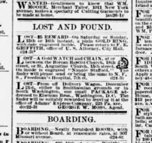 It appears that Stafford came back to Washington, D.C., in late December 1877, perhaps to visit old colleagues and friends from Howard University, who were the only people she is believed to have known in the area. However, during that time she lost a "gold watch and chain" which had "Nannie Stafford" engraved within. She advertised her lost watch multiple times in the Evening Star, mentioning that she lost it at or between Berean Baptist Church and St. Augustine. She asks whoever finds it to return it to "N.S.F. Freedman's Hospital" which today is Howard University Hospital.[18]