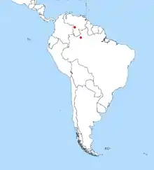 Nannostomus anduzei is restricted to the Amazonian region of the South American continent and has only been formally reported from two localities in the north of that area. The first, and site of discovery, was 20 km north of the small Venezuelan town of Puerto Ayacucho in a small lagoon, in the upper regions of the Rio Orinoco, at 5° 50' N, 67° 30' W. The second site was some 700 km to the southeast, in the Lago Caatinga, off the Rio Ererê, a tributary of the Rio Negro at 0° 14' S; 63° 53' W. These limited data are reflected in the range map above, where it is not possible to say where else the species might be found. However, because these fish occasionally do appear in the aquarium trade (see also below), their true range likely is somewhat wider than indicated. While the two known sites are geographically widely separated in two river systems, the Orinoco and the Negro are linked by the Casiquiare canal, so migration between the two sites is possible. N. anduzei does not appear in a systematic list of fishes of Columbia,[2] though the northern Orinoco locality is only a few kilometres from the Colombian border. This could represent undersampling in what is a remote part of the forest.