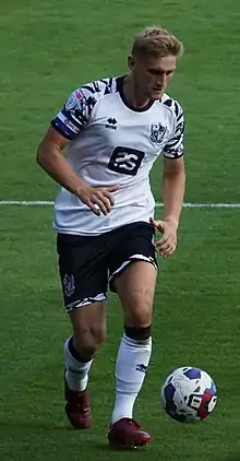 On 8 October 2022, he helped Vale to win 2–1 at Derby County and caused opposition goalscorer James Collins to be sent off after he elbowed Smith during a scuffle on the ground.[57] He was voted as the club's Player of the Month for December after he helped the team to record two clean sheets in victories over Plymouth Argyle and Morecambe.[58] He continued his good form into the following month and won a second consecutive Player of the Month award, starting all four of his club's January fixtures playing alongside Connor Hall, Dan Jones, Will Forrester, Lewis Cass and Aaron Donnelly in the back three.[59][60] He also played all seven games of February, scoring against Barnsley, helping to keep a clean sheet against Exeter City, and having a goal against Accrington Stanley controversially ruled out.[61] He signed a new two-year contract in April following weeks of "laid back" conversations with director of football David Flitcroft.[62][63] Smith was voted as the club's Player of the Year for the 2022–23 season, having missed just one league game throughout.[64]