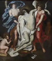 The Flemish art school is represented by remarkable pieces including "Procession of Silenus" by Peter Paul Rubens,[13] "Descent from the Cross" by Anthony van Dyck,[14] outstanding still-life paintings by Verbruggen and Jan Fyt and "Mountain landscape" by Joos de Momper. Portrait genre is represented by several canvases,[15] most notable ones are woman portrait by Pieter Pourbus and portrait by unknown artist of the 17th century. Two works of David Teniers the Younger disclose genre painting. Work of comparatively little-known artist Jan Cossiers "Faun visiting peasants" is an example of realism art.