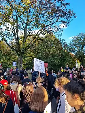 A placard in a Iran solidarity protests in Berlin on 22 October 2022 has written "NIAC IS NOT OUR VOICE" on it.