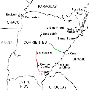 National Route 119 is a national road in Argentina, running north in the Center-South of Corrientes Province. It starts at the crossing with national routes 14 and 127 running for 109 kilometres (68 mi) until it crosses National Route 123 in Mercedes. The road is marked in red in the map. The whole length of the road is within Corrientes Province, crossing through Monte Caseros Department, Curuzú Cuatiá Department, and Mercedes Department.