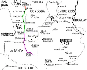 Formerly,[1] this route had a length of 761 km, up to the link with National Route 35, in the town of Perú, La Pampa Province, that is, the complete route indicated on the map. The section to the south of Nueva Galia, in San Luis, marked in purple and unpaved, passed to provincial jurisdiction through National Decree 1595 of 1979,[2] except for the section between km 263.87 and 296.78 that corresponded to the overlap with National Route 152. The Province of San Luis accepted the transfer in 1981.[3] The section between Villa Dolores and Villa Mercedes was paved in 1967, while the section between Nueva Galia and Villa Mercedes was paved in the first half of the 1970s.