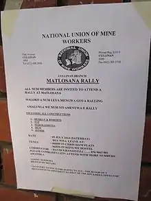 The National Union of Mineworkers (NUM) is a mainly mining industry related trade union, an organisation of workers with common goals through organised labour, in South Africa. With a membership of 300,000 as of 2014, it is the largest affiliate of the Congress of South African Trade Unions (COSATU).