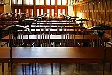 The interior comprises four wings and the central hallway. Light comes to the main entrance through windows in the main reading room, which is at the top of the main staircase, oriented crosswise. This symbolises the central thought of the building's architecture, "From the twilight of ignorance to the light of knowledge and enlightenment". The staircase and its 32 columns are built of the dark Podpeč marble, actually limestone. In addition, there is a small staircase with landings in the form of balconies in each of the four corner of the building. The main reading room, modelled after the industrial aesthetics of the 19th century, is decorated with large chandeliers. It has two glass walls at each side, divided in two symmetric parts by a column and forming part of the side walls of the building. There are wooden tables and chairs. The equipment in main spaces of the building is scarce. The cellar was renovated in 2000 by Marko Mušič, when the building was also additionally protected against earthquakes.
