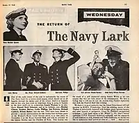 The Navy Lark[1] is a radio sitcom about life aboard a British Royal Navy frigate named HMS Troutbridge (a play on HMS Troubridge, a Royal Navy destroyer) based in HMNB Portsmouth. In series 1 and 2, the ship and crew were stationed offshore at an unnamed location known simply as "The Island". In series 2 this island was revealed to be owned by Lt. Cdr. Stanton.