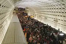 Due to the construction of the Washington Nationals' new stadium and other nearby projects, the Navy Yard–Ballpark station underwent a significant expansion to serve game-day crowds and expected increase in daily traffic from new residents and workers.[4][5] WMATA announced that it carried 21,492 people to the inaugural game on March 31, 2008, over half the total crowd; it was hailed as a success.[6] Passengers exit the station near the park's center field entrance.