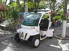 A Neighborhood Electric Vehicle (NEV) is a U.S. category for battery electric vehicles that are usually built to have a top speed of 25 miles per hour (40 km/h), and have a maximum loaded weight of 3,000 lb (1,400 kg).[1] Depending on the particular laws of the state, they are legally limited to roads with posted speed limits of 35 miles per hour (56 km/h) or less (in some states 45 mph or less). NEVs fall under the United States Department of Transportation classification for low-speed vehicles.[2] The non-electric version of the neighborhood electric vehicle is the motorized quadricycle.