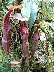 Right: Nepenthes izumiae growing as an epiphyte on a moss-covered branch in upper montane forest