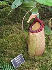 Pitchers arise from the end of the tendril, forming a tightly appressed curve. Lower pitchers are ovate to infundibuliform in shape[2] and may be up to 26 cm high and 15 cm wide.[7] A pair of ribs runs down the front of the pitcher, sometimes bearing fringe elements (≤3 mm wide) near the peristome. The pitcher mouth is oval and has an almost horizontal to slightly oblique insertion. The peristome is cylindrical, usually elongated into a short neck, and up to 20 mm wide. It bears a series of ribs (≤1 mm high) spaced 2 mm apart. The teeth lining the inner margin of the peristome are up to 4 mm long.[2] The inner portion of the peristome accounts for around 54% of its total cross-sectional surface length.[8] The glandular region covers the entire inner surface of the pitchers;[2] there is no waxy zone.[8] The glands are up to 0.8 mm in diameter and occur at a density of 200 to 500 per square centimetre. The lid or operculum is broadly ovate-cordate and up to 8 cm long and 6.5 cm wide. It has a rounded apex and lacks appendages. A number of ovate glands (≤1 mm in diameter) are concentrated near the centre of the lid's lower surface. A filiform spur (≤3 mm long) is inserted near the base of the lid.[2]