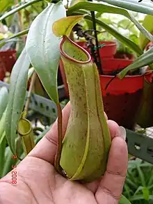 Nepenthes × ferrugineomarginata (/nɪˈpɛnθz fɛrʊˌɪnimɑːrɪˈnɑːtə/; from Latin ferrugineus "rust coloured" and marginatus "margined") is a natural hybrid between N. albomarginata and N. reinwardtiana.[1] It has been recorded from the islands of Borneo and Sumatra.[2] The type specimen was collected by Shigeo Kurata in Kenukat, West Kalimantan, in 1981. Kurata described the hybrid the following year. The name is a nomen invalidum as it was published without a Latin description.[3]