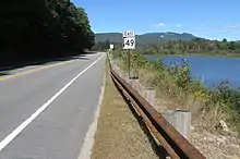The western terminus of NH 49 is in Campton at U.S. Route 3. Heading east over the Pemigewasset River, there is an interchange with I-93 (exit 28) shortly after the bridge. Turning northeast to follow the Mad River, NH 49 passes through the Lower and Upper Villages of Campton, intersecting with NH 175 before entering the town of Thornton. Passing the community of Goose Hollow, NH 49 enters the White Mountain National Forest as it crosses from the west to the east bank of the Mad River, and enters the town of Waterville Valley. Upon entering the Waterville Valley Resort, the state route ends, though signage is unclear exactly where. NH 49 is one of the few New Hampshire State Routes which does not end at another numbered route. The Waterville Valley portion of Rt. 49 is named for Army SPC Marc Decoteau, killed in Afghanistan on January 29, 2010.[2]
