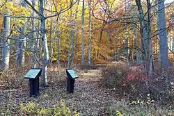 The Patriots' Path, also known as the New Jersey Brigade Trail here, is needed to access the marked historical sites. One trailhead is on Hardscrabble Road, another on Jockey Hollow Road.[4]