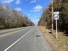 Route 68 is a state highway located in Burlington County in the U.S. state of New Jersey, serving as the main connector between the New Jersey Turnpike and the Fort Dix entity of Joint Base McGuire–Dix–Lakehurst (JB MDL). It runs from County Route 616 (CR 616) inside Fort Dix to U.S. Route 206 (US 206) in Mansfield Township, 0.34 mi (0.55 km) south of the New Jersey Turnpike; a total route length of 7.92 mi (12.75 km). The route passes through Wrightstown and Springfield Township as a two-lane undivided road, crossing CR 537. It continues through Mansfield Township as a four-lane divided highway, intersecting with CR 543. Outside of ASA Fort Dix, Route 68 passes through mostly agricultural and residential areas.
