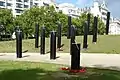 The memorial comprises 16 bronze "standards" set out on a grassy slope at the east end of the Hyde Park Corner traffic island. Each standard is a cross-shaped metal girder weighing about 700 kilograms (1,500 lb), cast by the Heavy Metal Company in Lower Hutt, and set in a concrete foundation, with surrounds of British slate. The dark patinated surfaces of the standards are adorned with different texts, patterns and small sculptures, all symbolic of New Zealand, including fern shapes, a manaia figure, plants and animals from New Zealand, emblems of the New Zealand armed forces, and references to authors and artists from New Zealand.[3]