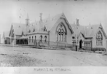 In 1859, an additional school was opened to satisfy the needs of parents who wanted a government controlled school. Newcastle Public School was opened in Brown Street in the basement of the Congregational Church, after which it moved to a classroom opposite the current site.[1] In 1878, the school moved to the current site in Tyrrell Street. The success of this new public school led the state government to take control of the church school in 1883 and name it Newcastle East Public School.