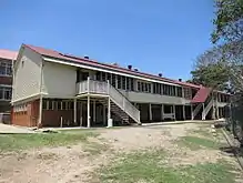 Instead, in 1954 a timber Boulton & Paul Building was constructed, comprising two classrooms (now called Block B).[69][70] Responding to materials shortages and the pressures of the baby boom, the Department of Public Works imported a British prefabricated building system from manufacturers Boulton & Paul Ltd of Norwich. Based on an 8-foot (2.4 m) planning and construction module, the prefabricated elements in the Boulton & Paul system included wall panels, ceiling panels, roof trusses and banks of awning windows. The buildings were constructed at many schools across Queensland between 1952 and 1958.[71][72] Boulton & Paul buildings were timber-framed and clad, had a verandah as circulation, and a gable roof. Ideally, they were orientated so the verandah faced north and the classroom faced south but were also added as extensions to existing buildings regardless of orientation. The building could be high or low-set and had extensive areas of timber framed awning windows, providing more glazing than had ever been used in Queensland classrooms; almost the entirety of the verandah wall and the opposite classroom wall were glazed, providing excellent natural ventilation and lighting. The classrooms were 24 by 24 feet (7.3 m × 7.3 m), larger than most previous classrooms.[73] The flexibility of the system meant that the number of classrooms constructed could vary to suit the needs of a particular school. In some cases, Boulton & Paul classrooms were used to form long, interconnected blocks, such as at Geebung State School (1951–55), Dalby State High School (1954) and Indooroopilly State High School (1953-54).[74][75][76][1]