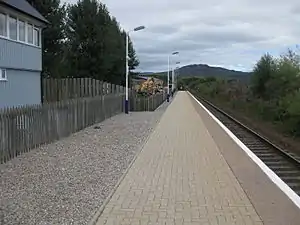Newtonmore railway station serves the village of Newtonmore, Highland, Scotland. The station is managed by ScotRail and is on the Highland Main Line. The station is 68 miles 62 chains (110.7 km) from Perth, between Dalwhinnie and Kingussie, and has a single platform which is long enough for a ten-coach train.[4] It is currently the only station on the Highland Main Line to have one platform, although the former second platform can still be seen adjacent to the first platform.[4]