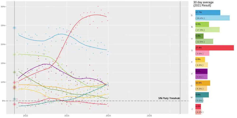 2021 parliamentary election 25 Sep 2021 24.4 17.3 12.6 9.9 8.9 8.6 8.3 5.5 4.1 0.5 7.1
