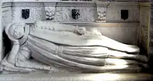 His monument on the north side of the chancel of Bovey Tracey Church is believed to have been made by the Exeter sculptor John Deymond[33] who is recorded in the List of Freemen of the City of Exeter in 1597 as the apprentice of Richard Deymond. The monument has the "blunt inscription" 1620 ID on an otherwise blank panel above the effigy, and is similar in many respects to the monument to Sir John Acland (1552–1620) in Broadclyst church, also thought to have been made by John Deymond.[34]