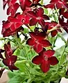 Nicotiana × sanderi,[4] also known as Nicotiana × sanderae, is a hybrid of the tobacco species Nicotiana alata (syn. N. affinis) and Nicotiana forgetiana (syn. N. rubra).[2][5] It is the most common ornamental Nicotiana variety found and sold in the United Kingdom. Nicotiana × sanderi requires soft soil mixed with sand to thrive. The plant will grow to heights of 3 feet (0.91 m) and will give off a sweet scent in the evening, like most Nicotiana plants. Nicotiana × sanderi is not hardy against frost and will die if it comes in contact with it; however, it withstands drought. Because of its size, N. × sanderi is used as a house or garden plant.