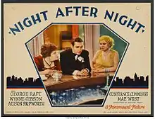 Night After Night is a 1932 American pre-Code drama film starring George Raft, Constance Cummings, and Mae West in her first movie role. Others in the cast include Wynne Gibson, Alison Skipworth, Roscoe Karns, Louis Calhern, and Bradley Page. Directed by Archie Mayo, it was adapted for the screen by Vincent Lawrence and Kathryn Scola, based on the Cosmopolitan magazine story Single Night by Louis Bromfield, with West allowed to contribute to her lines of dialogue.