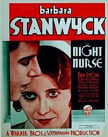 Night Nurse is a 1931 American pre-Code crime drama mystery film produced and distributed by Warner Bros. directed by William A. Wellman, and starring Barbara Stanwyck, Ben Lyon, Joan Blondell and Clark Gable. The film is based on the 1930 novel of the same name by Dora Macy, the pen name of Grace Perkins.[1] The film was considered risqué at the time of its release, particularly the scenes where Stanwyck and Blondell are shown in their lingerie. Clark Gable portrays a viciously violent chauffeur who is gradually starving two little girls to death after having already purposely run over their slightly older sister with a limousine, killing her.