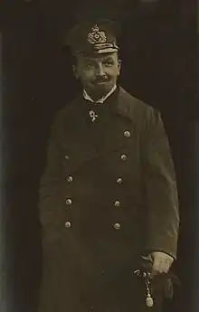 In 1915, after the outbreak of World War I, the banana freighter Pungo of the F. Laeisz line was reconstructed as a minelayer and armed merchantman, renamed SMS Mowe, and placed under Dohna's command.[3] Through his success as commander of the Möwe, Dohna and his crew became popular war heroes like the crews of Wolf (commanded by Karl August Nerger) and Seeadler (commanded by Felix von Luckner). A motion picture was made in 1917 about Dohna's exploits,[4] and he was appointed naval adjutant to the German emperor, Wilhelm II.