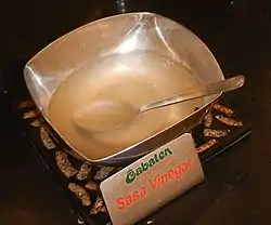 Vinegar is one of the most important ingredients in traditional Filipino cuisine.[1][8] Like other types of vinegars, nipa palm vinegar is used primarily in dipping sauces (sawsawan). It may also be sold spiced with ginger, garlic, and chili peppers (which are boiled beforehand).[10] It can also be used in salad dressings as well as an ingredient in various dishes like paksiw and atchara pickles.[9]