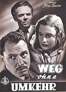 No Way Back (German: Weg ohne Umkehr) is a 1953 West German drama film directed by Victor Vicas and starring Ivan Desny, Ruth Niehaus and René Deltgen.[1] It was made at the height of the Cold War.