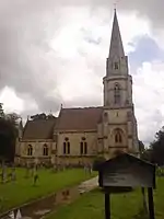 Within the village there is a Church of England Church, *All Saints,.[68] All Saints Anglican parish church is Grade II* listed.[69] It was built in 1862 by George Gilbert Scott, and according to Pevsner is a "typical estate church" and "one of Scott's major works". It is of Early English style in Ancaster stone, with a 130 feet (40 m) steeple. On the walls are drawn religious scenes outlined in red. There are stained glass windows by Clayton and Bell. Monuments are to Sir William Ellys (died 1680), attributed to William Stanton, to the Fourth Earl of Buckinghamshire (died 1816), to Rev. Henry Hobart, Dean of Windsor (died 1846), and to the First Earl of Ripon (died 1859), this designed by George Gilbert Scott with an 1862 effigy by Matthew Noble.[70] All Saints was built on the site of a previous St Peter's church built by the Third Earl of Buckinghamshire in 1775, who destroyed an original St Peter's Church because it was "too near the Hall". The monument to Sir William Ellys is from the original church.[71] Cox describes the 1775 church as having been "a mean affair".[71][72]