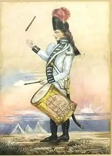 Long boots were discontinued, except for mounted officers, on 12 April 1814. On 22 June 1820 epaulettes, buttons and ornaments of dress were changed from gold to silver, although serving officers were permitted to retain their old style of uniform unless called on for actual service. In January 1831 the old uniform was finally discontinued, with orders that all uniforms must meet the latest King's Regulations and include black velvet and silver epaulettes.[33]