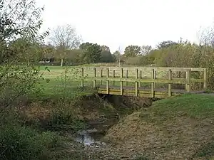 A stream called the Ravensbourne[10] runs for 300 metres across the park. Whilst originally hidden underground[11] in steel and concrete pipe (called a Culvert)[12] in 2000 it was re-exposed (known as daylighting) and planting was put around it.