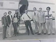 The entire 1976 N.C. Libertarian ticket: Arlan Andrews (far left), candidate for governor; Roger McBride (center), presidential candidate; Carl Wagle (third from right), 5th district Congressional candidate; and Andrew Eiva (second from right, aide-de-camp to Andrews. The others are unidentified. (Photo Courtesy Arlan Andrews)