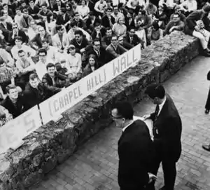 UNC Student Body President Paul Dickson (right) standing beside Frank Wilkinson (left) before addressing the crowd on Franklin Street
