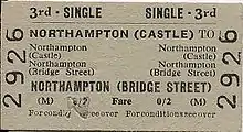 Closures accelerated under British Railways with the withdrawal of services from Bridge Street station, which lost much if not all of its significance following the opening of the Loop,[24] on 4 May 1964[8][34] when the Northampton to Peterborough line was closed, leaving only Castle station serving the town.[26] As a result, Castle station was renamed Northampton on 18 April 1966.[8][36] In addition, the bay platforms 4 and 5 were removed and the area converted into an overflow car park.[37] The Great Northern and London and North Western Joint Line closed to all passenger traffic except for a workmen's service on 7 December 1953; the workmen's service between Market Harborough and East Norton ended on 20 May 1957.[38] The section between Welham Junction and Marefield North Junction closed in November 1963, followed by the Rugby and Stamford Railway on 6 June 1966.[38] The line to Market Harborough closed on 15 August 1981.[39]