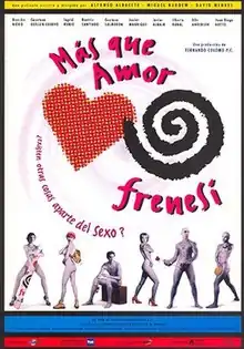 Not Love Just Frenzy (or Más que amor, frenesí in Spanish) is a 1996 adventure and drama film, directed by a triumvirate of Alfonso Albacete, Miguel Bardem and David Menkes. They have a collective name of Peliculas Freneticas (Frenetic Films).[2] It is Miguel Bardem's first feature film with Alfonso Albacete,[3] using Carlos Bardem, the cousin of Miguel, in his acting debut. The style of the film is reminiscent of works by Pedro Almodóvar,[4] according to a New York Times review.[5] Más que amor, frenesí brought Bardem, Albacete and Menkes a Goya Award nomination for Best Newcomer Director.[6]