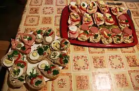 Obložené chlebíčky consist of sliced bread that has butter or another kind of spread on it, atop which a variety of toppings may be added. Toppings used on obložené chlebíčky include various cured meats such as ham, salami and sausage, sliced hard-boiled egg, cheeses, cream cheese, cucumber, tomato, fish paste, salads and various spreads prepared with meat, vegetables or cheeses.[2][3] Some vegetables such as bell pepper, pickle, tomato, radish and parsley may be used as a garnish.[4] Veka or baguette bread may be used in their preparation.[2][6] They are sometimes sold as a snack food at food stalls during festivals and in bars.[2][6]