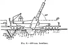 The howitzers had a Welin breech block and used separate loading bagged charges and projectiles. To load the howitzer the barrel was lowered to -8° and a loading ramp to the howitzer's breech could be erected. The howitzers had a hydro-pneumatic cradle recoil system where the cradle recoiled up a slightly inclined rear deck which helped return the howitzer to battery after firing. The carriage used ground platform anchoring and the rear bogie could be jacked up to help absorb recoil. The carriage used a car traversing mount so traverse was limited to a few degrees each side of the howitzer centerline.[6] The howitzers normally required two days of setup before firing, which consisted of reinforcing an area of track with wooden beams and digging a pit for the earth anchor and another for howitzers breech at angles of elevation more than 45°. There were also four jack stands that could be lowered onto the platform and fastened to the timbers to provide a stable firing platform.[7]